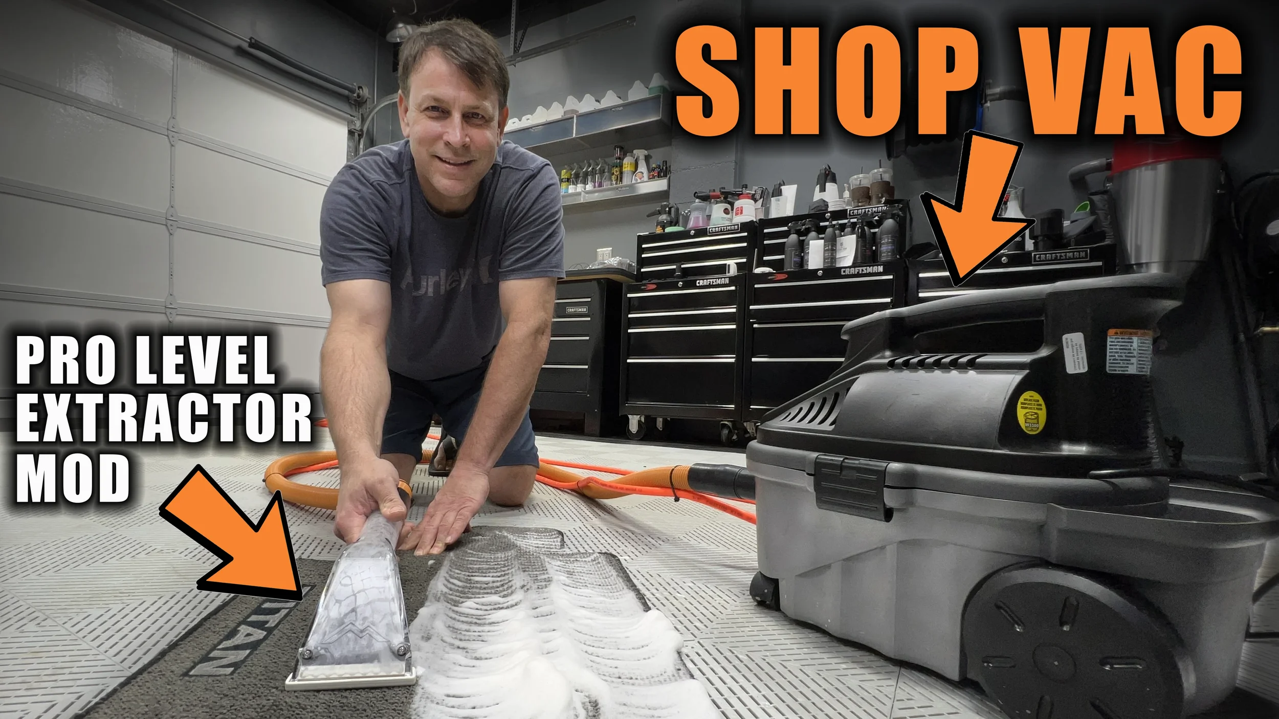 Shop Vac Extractor Tip: Start the process with the dry filter and vacuum hose installed. Fully vacuum the vehicle removing all loose dirt & debris. Swap to the wet filter, hook up the extractor conversion hose and attach it to a nearby garden hose water source. You now have a full blown carpet ans upholstery extractor. For improved cleaning attach to a hot water source if its available. After the extraction is complete, rinse the shop vac clean and allow to dry while you are on your way to the next detail. Easy.
